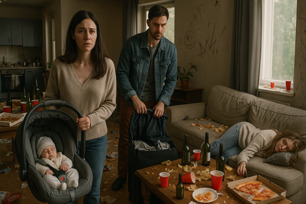 Повсюду валялись пустые бутылки, чипсы, грязная посуда. Стены украшали какие-то кривые рисунки маркерами. На кухонном столе — остатки вчерашней вечеринки: объедки, перевёрнутые стулья, окурки.