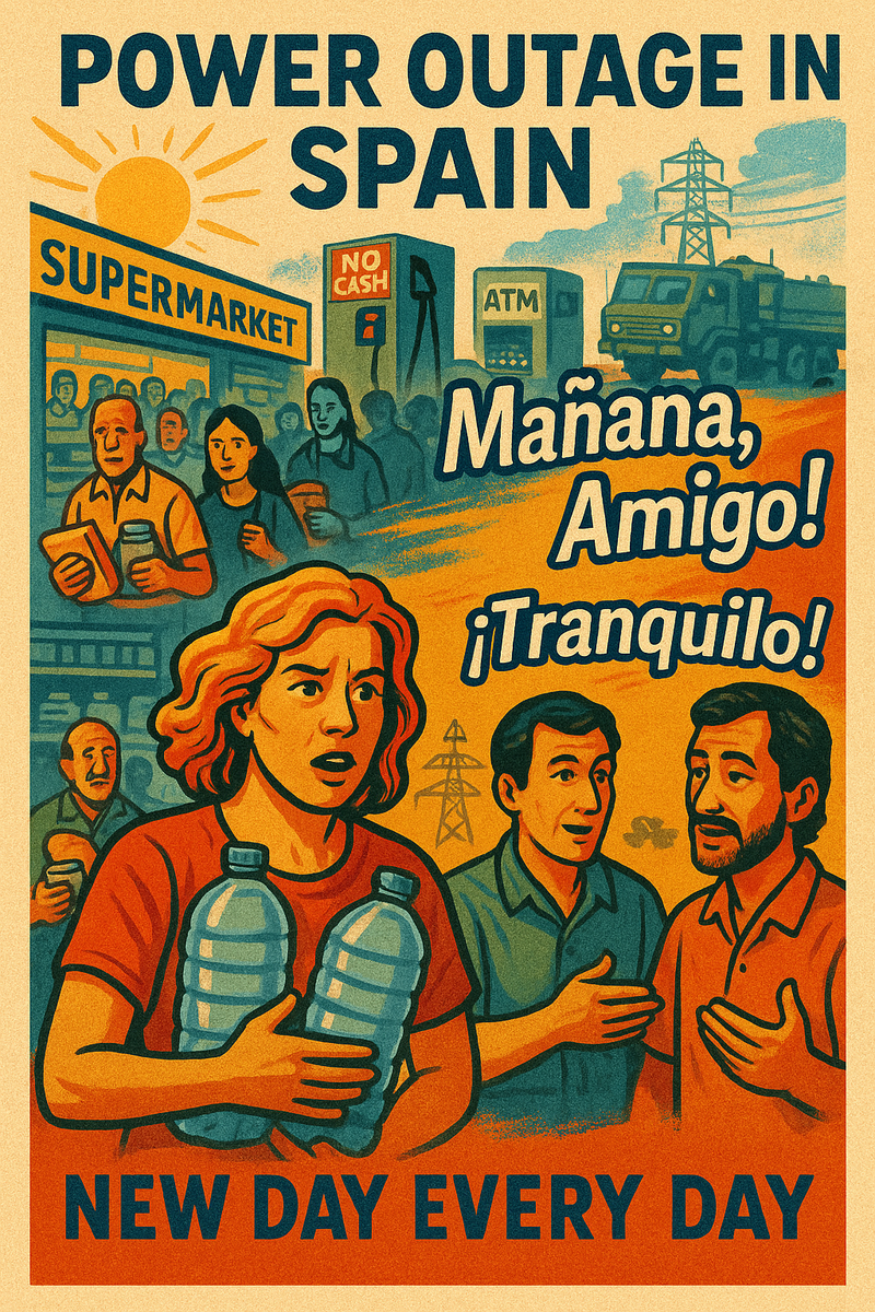 В понедельник утром Испанию накрыло что-то, похожее на апокалипсис в стиле "лайт" — свет погас повсюду. В одно мгновение цивилизация хрустнула, как тонкий лед. Никакой романтики — только реальность: электричества нет. Всё. Русскоязычные сработали мгновенно, как спецназ: вода, консервы, продукты длительного хранения — улетели в тележки в первый же час. В магазине Испанцев не было. Они раскачиваться начали намного позже. Мы привыкли: хочешь жить — готовься заранее. А вот местные растерялись. Испанцы, родившиеся под сенью вечного солнца и спокойствия, вдруг столкнулись с чем-то, о чём раньше только читали в книгах. К двум часам дня магазины трещали от очередей. Вода исчезла. Тунец был разобран подчистую. Хамон, пиво, хлеб и молоко длительного хранения — всё сметали, как будто завтра наступит зомби-апокалипсис. АЗС Заправки стояли мертвыми. Без электричества автоматы не работали, бензин и дизель не наливали - меняли только газовые баллоны и только за нал. Испанцы в шоке перебирали плас