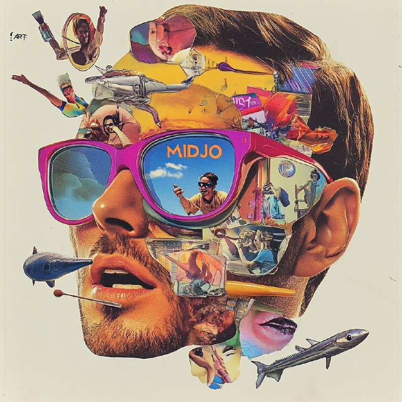 😎Коллаж Если присмотреться к элементам криповенько конечно, но в общем идея классная) Sci-fi art Collage, cut and pasted elements of the head in collage form different characters with glasses and eyes made from colorful plastic parts for an advertisement by JOilgoon , the words "?", A man doing random funny things, one person is swimming, another skydiving wearing sunglasses, a woman painting her nails, there's a fish who has legs, at the top of it all you can see text written as "MIDJO ART" , surreal art, modern art. Surrealism, all on light background, magazine style, golden ratio, vintage, 70s Если понравилось, ставьте 👍 #midjourney #flux #dalle #gpt #midjo #art #midjoart #luma #hailuo #minmax #kling #video #ai #faceswap 🤖 Попробуйте сами с Midjourney Bot
