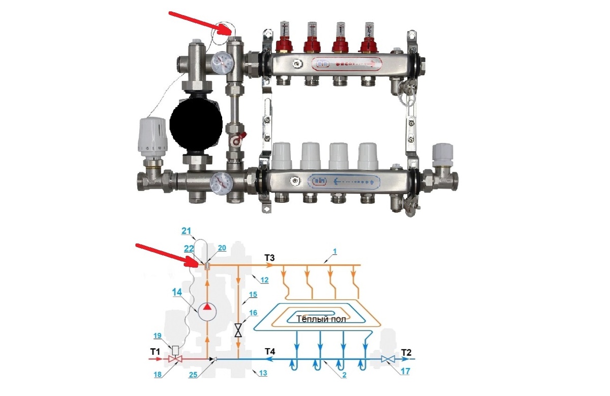 Хороший вопрос - "У вас на фото погружной датчик с капиллярной трубкой над байпасом находится, а на схеме принципиальной на насосе. Подскажите, как правильно должно быть? Или будет работать и в обоих вариантах установки нормально?" Ответ: Да будет работать. Датчик термоголовки, установленой на регулировку теплоносителя для подачи, независимо от стороны и места подключения клапанов магистрали (разносторонне, сбоку, снизу, сверху), может располагаться в любом из свободных отверстий на блоке ПОДАЧИ смесительного узла, куда Вы вкрутите гильзу с датчиком. Отметили эти места на картинке: На видео показали все множество вариантов подключений узла Компакт-Б https://dzen.ru/video/watch/67874fd2f295c7451151e170 Про Термоголовку ТСГ ВД и гильзу для нее мы рассказывали тут: