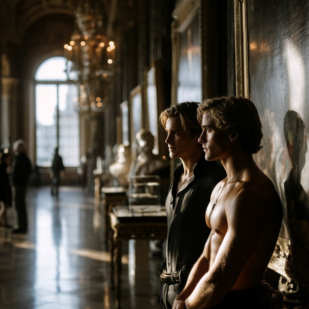 Создано на основе запроса: 2 college age male royals with dark blond mop hairstyles, posing for a picture muscles aesthetics, inside the