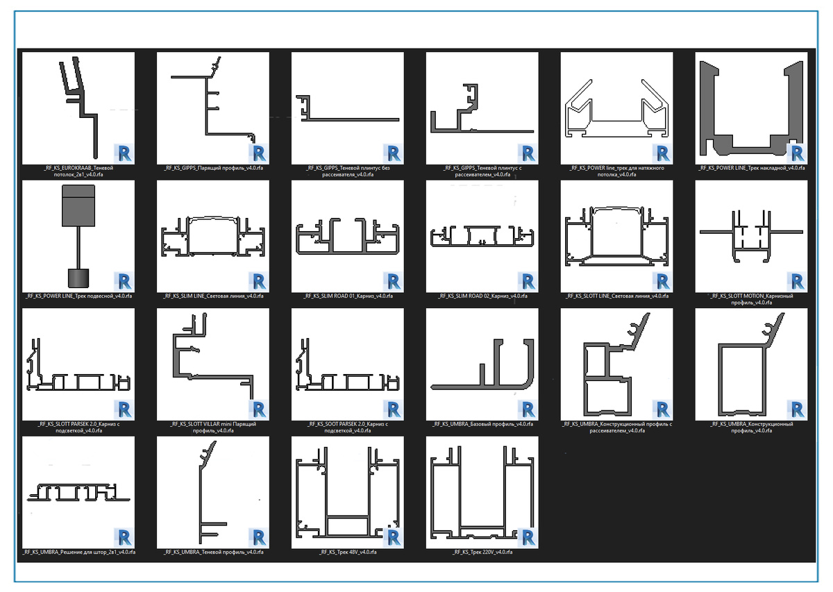 С помощью данного набора семейств, вы сможете реализовать свои самые смелые решения в дизайн проектах и создавать в современном стиле с множеством подсветок или теневых эффектов. Избавьте себя от создания чертежного вида. Семейства созданы максимально детализировано и достаточно создать разрез на котором уже будут показаны профили и их форма и прилегание к плоскостям. ОПИСАНИЕ Категория модели: Обобщенные модели, осветительные приборы Версия Revit: 2022 Размещение: грань и на потолке Состав набора: Семейства обобщенные модели: Семейство осветительных приборов: Обзор на осветительные приборы, читайте в статье "Дизайнерское освещение для Revit" ВОЗМОЖНОСТИ Семейства профилей устанавливается на любой плоскости. Автоматически вырезается плоскость на которой размещаете. При использовании на потолке: перейдите на план потолков, выберите семейство подходящее под тип потолка, нажмите "Разместите на грани" Скачайте БЕСПЛАТНО набор точечных светильников ФУНКЦИОНАЛ Весь функционал который реализ