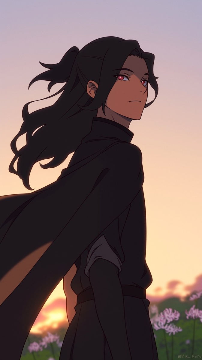 Создано на основе запроса: Anime movie PV, a handsome man, long black hair in a ponytail, red eyes, wallpaper, voxel, standing in a field of