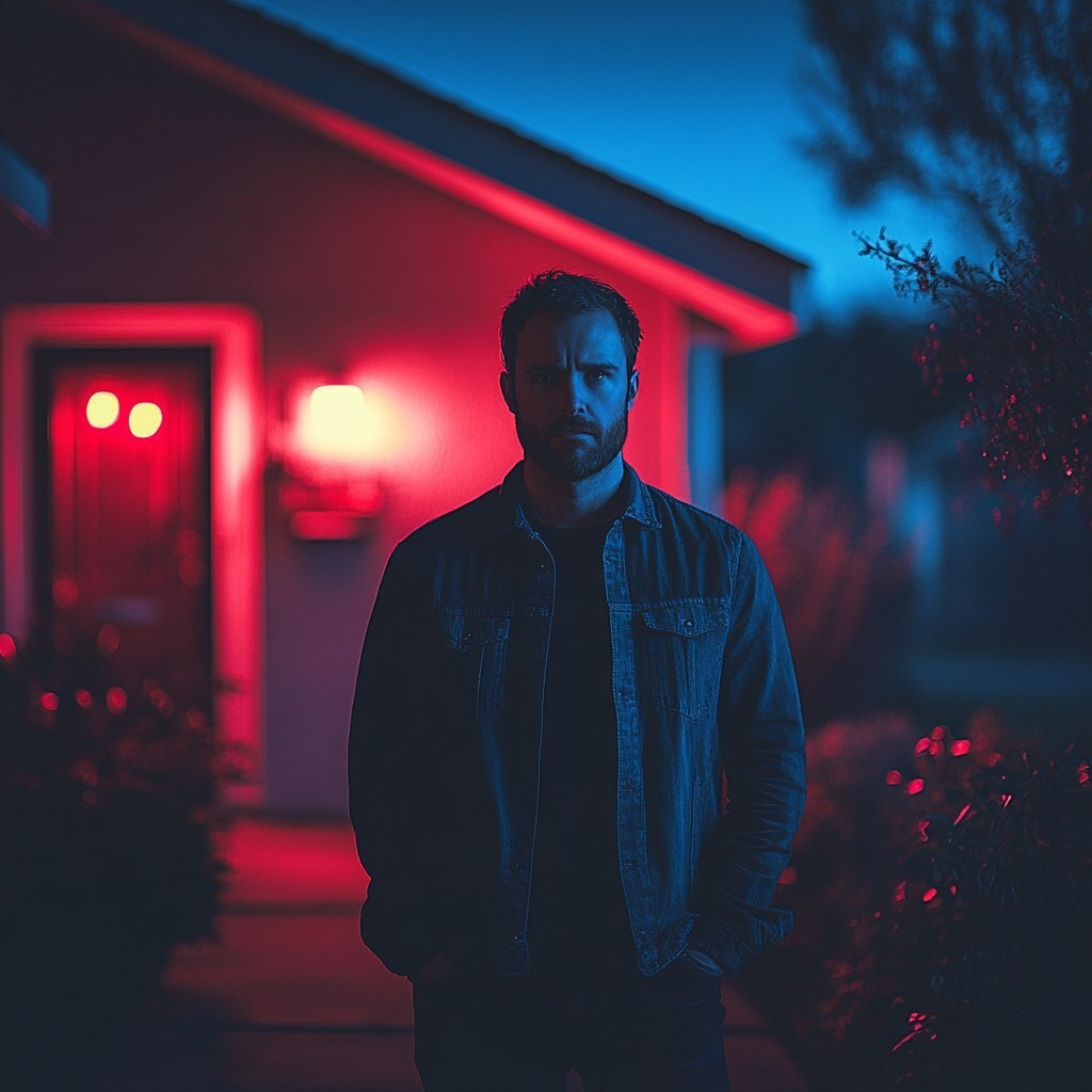 Создано на основе запроса: A serious, cinematic photograph of a man standing alone at night near a suburban home entrance, illuminated by