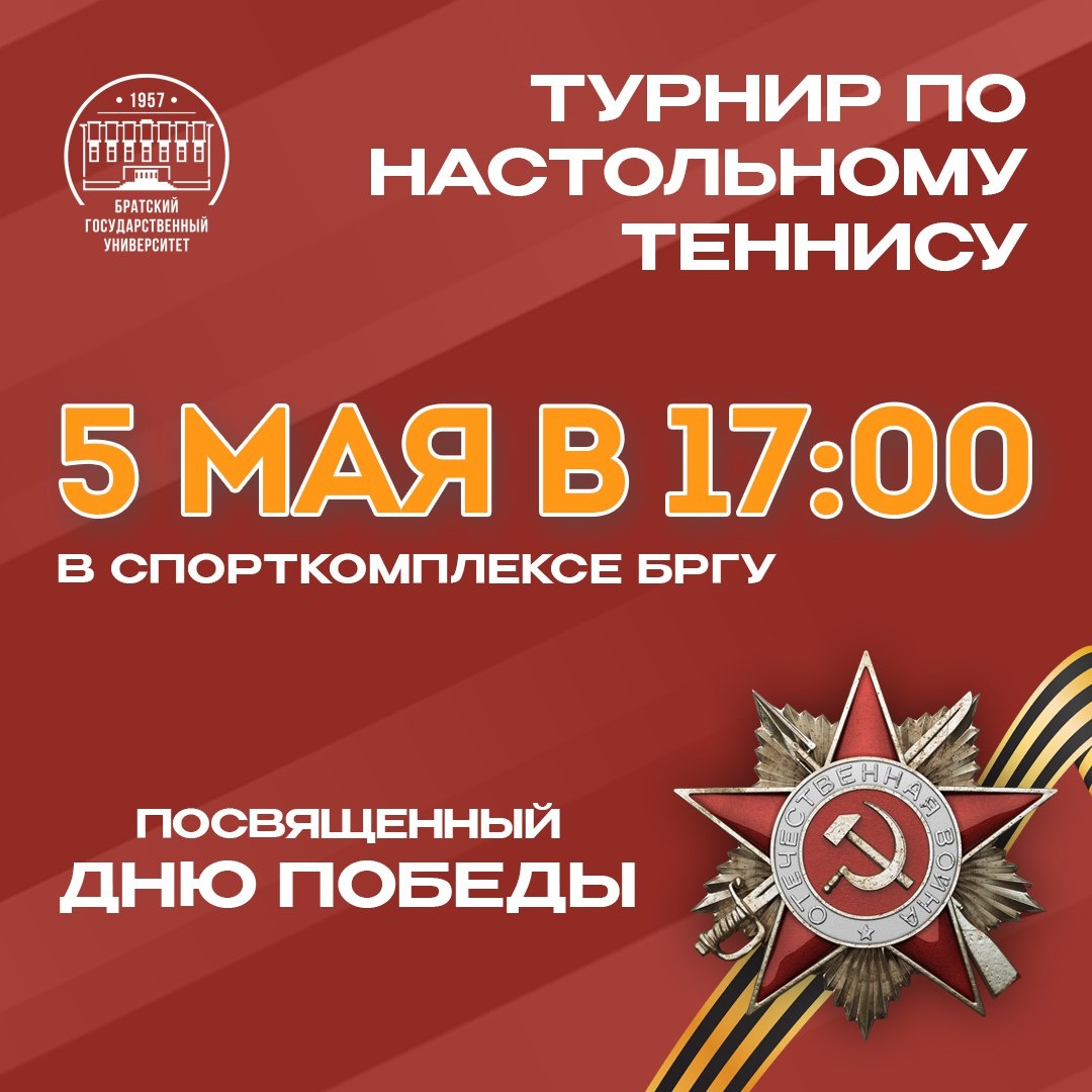 Приглашаем студентов БрГУ на праздничный турнир по настольному теннису 🏓 Мероприятие пройдет 5 мая в 17-00 в Спорткомплексе БрГУ. Количество мест ограничено. Предварительная запись у старшего преподавателя ЭБЖиФ Колесниковой О.А. 📝
