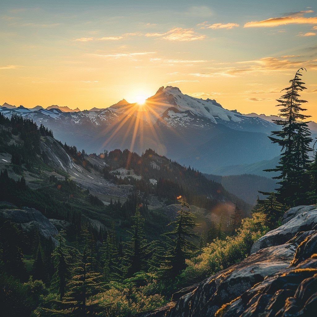 Создано на основе запроса: mountain landscape at sunset shining through the peak of the mountains