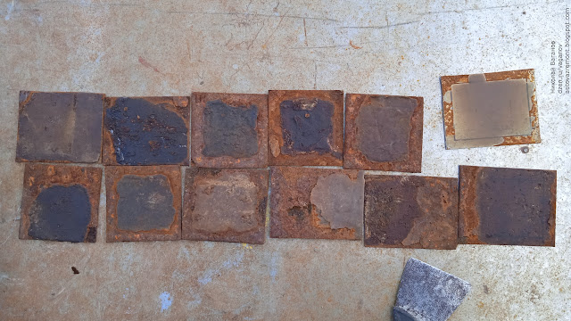 Итак, подведем итоги теста смесей пушечного сала по прошествии двух лет. Смоем покрытие с пластин и посмотрим на состояние обработанной поверхности: 1. Пушсало + трансмиссионное масло ТАД-17 - покрытие осталось достаточно мягким, обработанная поверхность лишь с краев немного подверглась воздействию коррозии. 2. Пушсало + отработка моторного масла - почти аналогично с первым образцом. 3. Пушсало + битумная мастика - покрытие сверху подсохло и потрескалось, начало отслаиваться с краев, под ним обнаружена пара крупных очагов ржавчины и несколько мелких. 4. Пушсало + Раст-стоп Б - ржавчина слегка зашла с краев под покрытие, но большая площадь осталась нетронутой. 5. Пушсало + Мовиль - покрытие подсохло и стало отслаиваться с краев, обнаружен очаг ржавчины в середине пластины, основная площадь осталась нетронутой. 6. Пушсало + нигрол - покрытие сползло по пластине и на том месте начала развиваться ржавчина, однако, основная площадь осталась нетронутой. 7. Пушсало + автопластилин - покрытие