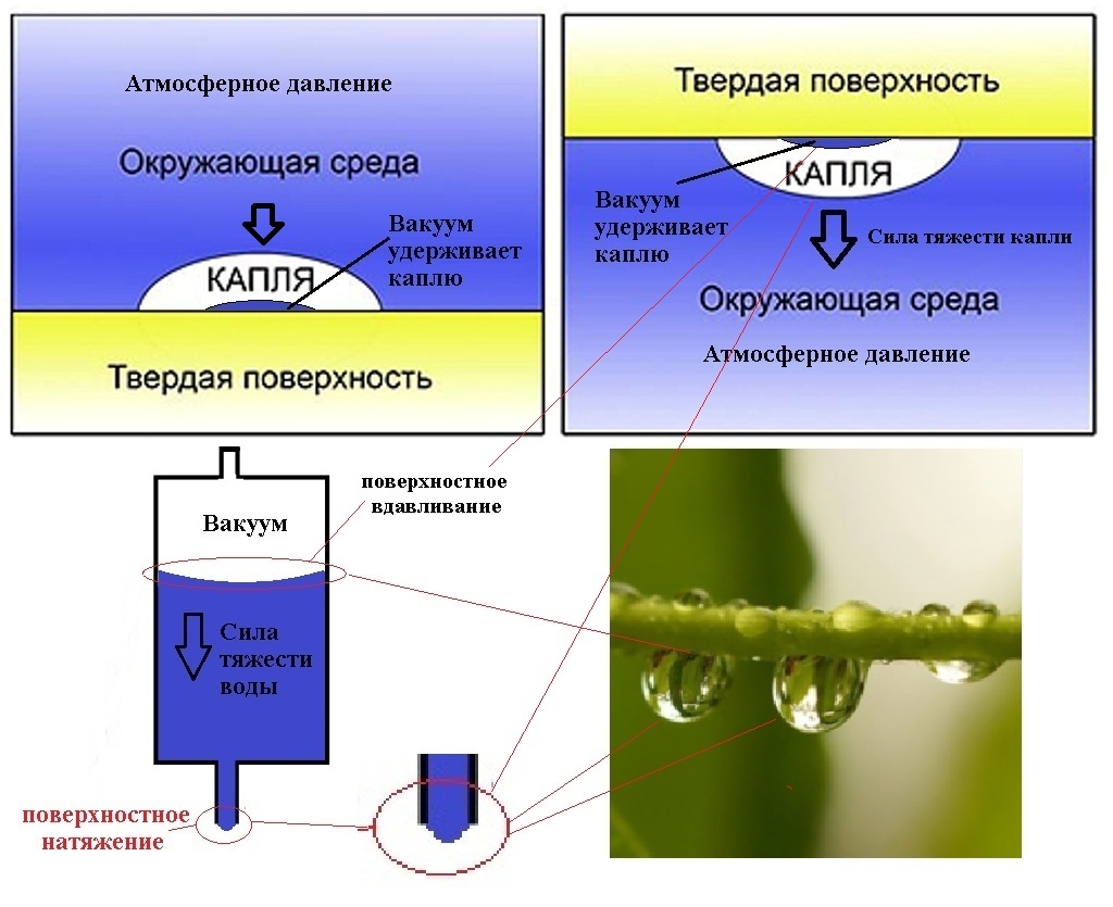 Возьмите трубку, опустите ее наполовину в воду, закройте пальцем верхнее отверстие трубки, поднимите воду вместе с трубкой. Принцип действия основан на разнице атмосферного давления и вакуума внутри трубки между пальцем и водой. Эта разница давлений удерживает столб воды в самой трубке. Столб воды из трубки будет стремиться вытечь под силой своей тяжести и образует на выходе из трубки каплю, вода как бы вытягивается, это явление получило название поверхностного натяжения воды, с другой стороны столба вода на тот же объем происходит поверхностное вдавливание поверхности воды.