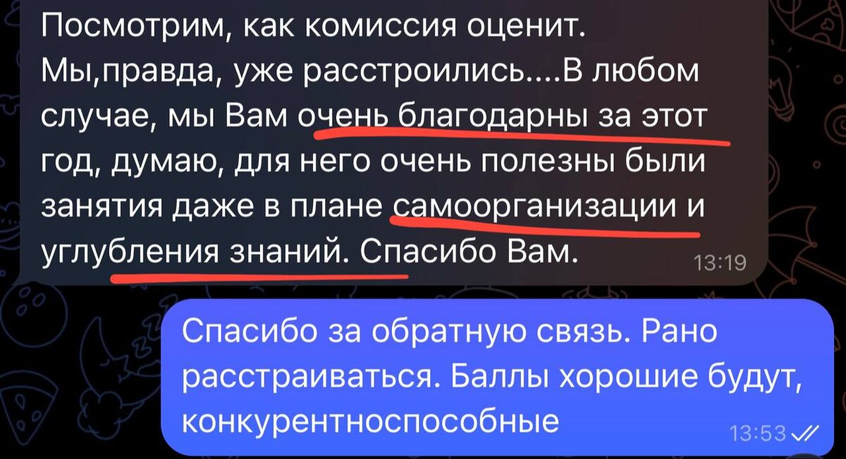 Этого мы не ожидали Пятница. Педсовет. Мама ученика присылает результаты вступительных испытаний в Физтех-лицей им. П.Л. Капицы. У меня аж в глазах потемнело Две недели назад мама после экзамена дала обратную связь со словами благодарности (на фото). Мы ждали хорошие баллы (75-85), потому что после разбора решения стало понятно, что есть тонкие места, которые могут снизить баллы. В любом случае, рано расстраиваться, нужно дождаться критериев оценивания А вышло… как вышло…🙈 И по критериям у ученика по математике - 100 баллов 🔥100 баллов из 100!!!🔥 Это победа! Завтра ждем объявления проходных баллов на второй этап поступления, но что-то мне подсказывает, что нужно продолжать готовиться к Летней школе. Чуть позже отойду от всего, расскажу историю подготовки ученика. Или не надо?
