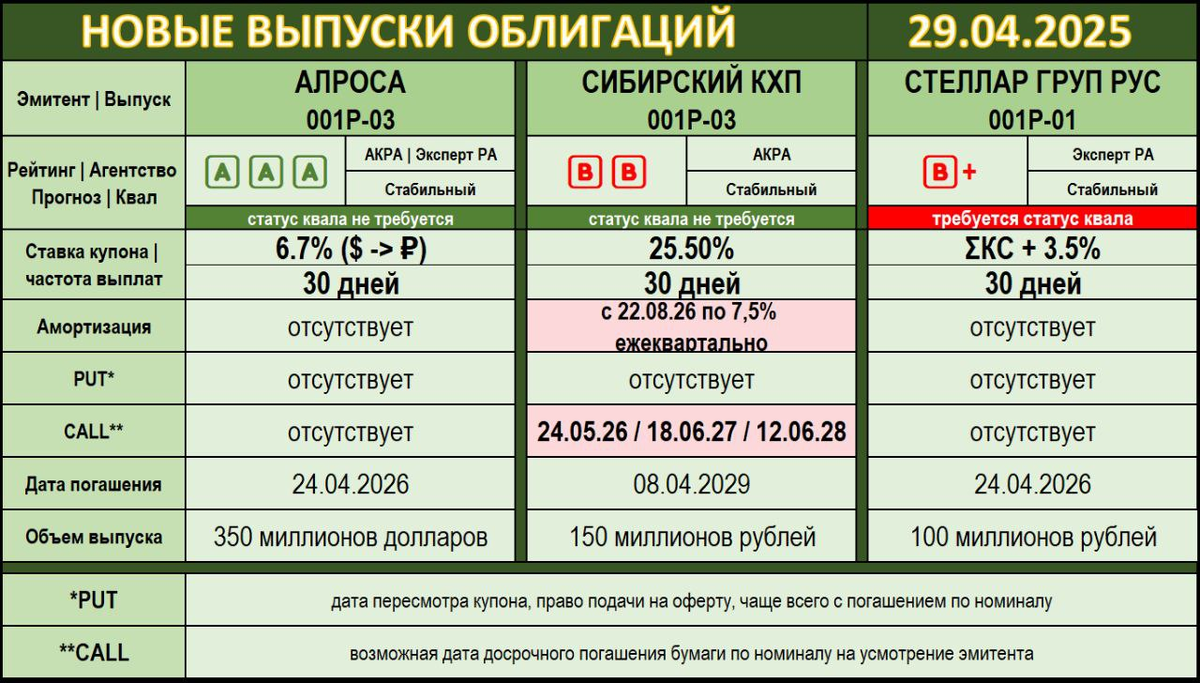 👻 Бодрый привет, дорогие читатели! Если майские праздники вас еще не засосали, то пост с новинками дня явно пригодится. А если засосали... то тоже пригодится, только попозже :) ⭐️ Начало торгов сегодня у трех различных бумаг: 〰️〰️〰️〰️〰️〰️〰️〰️〰️〰️ 🔴 СТЕЛЛАР ГРУП РУС 001Р-01 📊 🅱️➕ ➖ https://raexpert.ru/releases/2024/dec24d (24.12.2024) 🔹 ISIN: $RU000A10BHY1 ▪️ Купон плавающий: ΣКС + 3,5% ▪️ PUT/CALL: отсутствуют ▪️ До погашения 1 год ➤ Выпуск, который можно смело пройти мимо, даже если появится в стакане. Непубличный сбор, нерыночная премия, и любое другое "не", которое только можно придумать. Мы же с вами НЕ благотворительная организация :) Следующий! 〰️〰️〰️〰️〰️〰️〰️〰️〰️〰️ 🔴 СИБИРСКИЙ КХП 001Р-03 📊 🅱️🅱️ ➖ https://www.acra-ratings.ru/press-releases/5000/ (15.08.2024) 🔹 ISIN: $RU000A10BHX3 ▪️ Купон фиксированный: 25,5% ▪️ CALL: 13,26 и 38 месяцев ▪️ До погашения 4 года ➤ Классический ВДО-эмитент, оценивающий себя сильно выше фактического рейтинга. Ответ на вопрос даст доходность