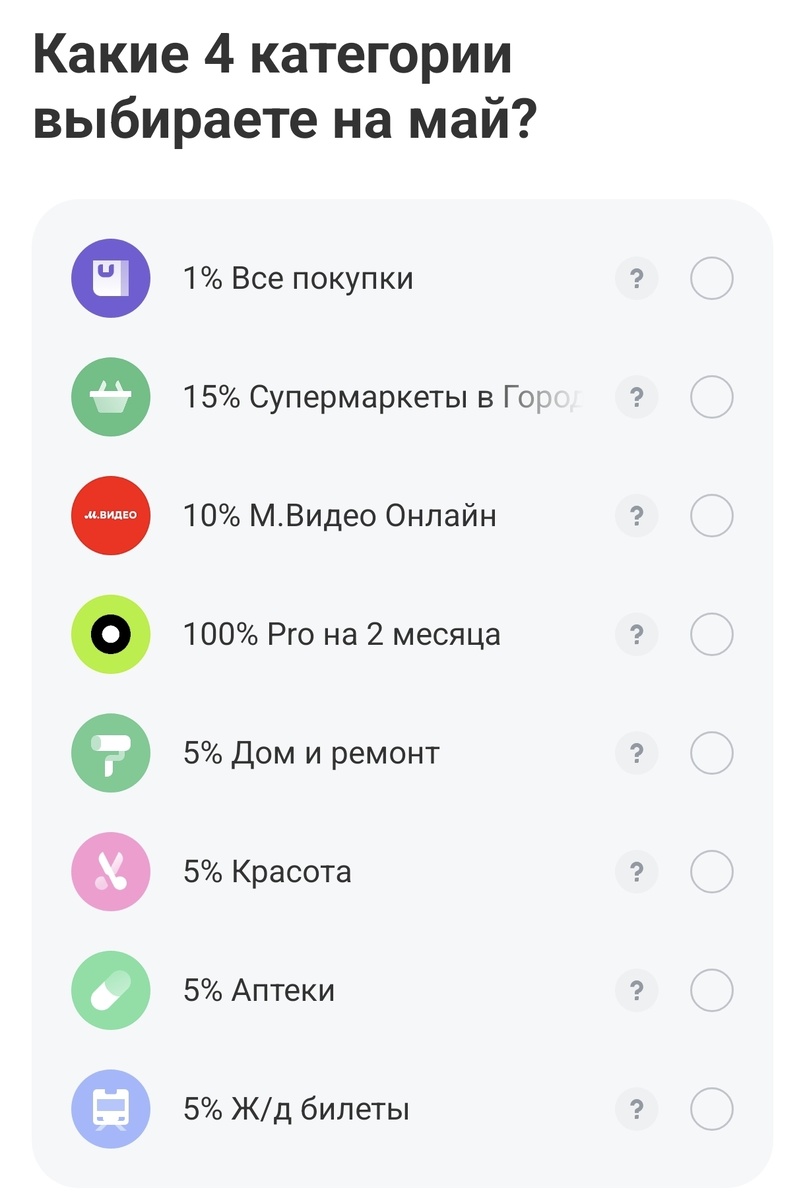 Начну с Т-банка. Вот какие категории они мне предложили:
