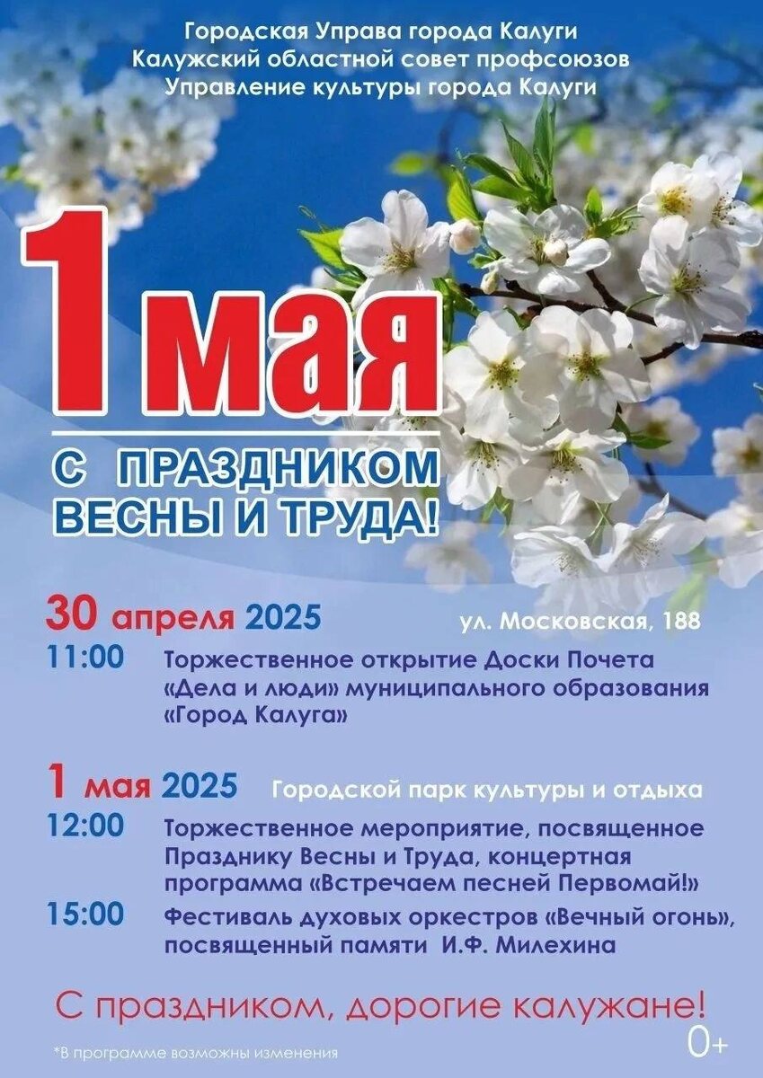 🌸 Праздник Весны и Труда в Калуге В честь 1 Мая в городе пройдут торжественные мероприятия. Запланированы открытие Доски Почёта, фестиваль духовых оркестров и концертная программа в парке. Подробности — на афише. 🤖 Прислать новость 📺 Заказать рекламу