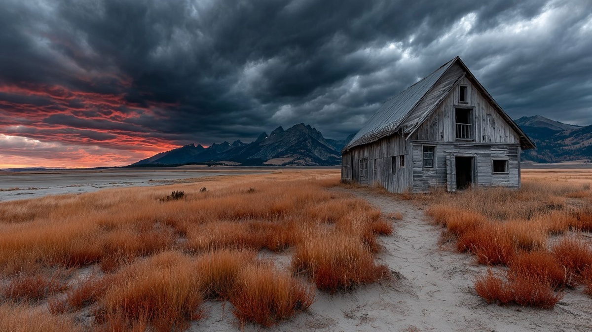 Создано на основе запроса: les plaines du Wyoming a perte de vue avec en arriere plan les rocheuses. une vieille grange est isolee dans la plaine au centre d'herbage d'un vert citron. des bisons et des mustangs courent dans la plaine. des rayons de soleil percent les nuages. golden and pink hues.