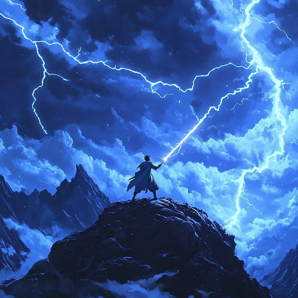 Создано на основе запроса: epic anime fight scene PV where a male fairy is wielding a sword that calls lightning from the sky on a mountain