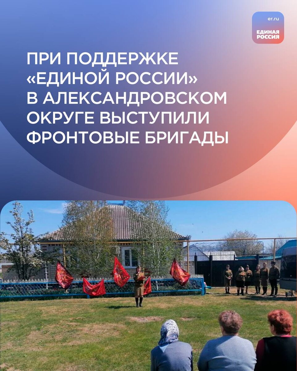 Выступления концертных фронтовых бригад местных Домов культуры прошли в сёлах Грушевском и Саблинском Александровского муниципального округа. Они приурочены к 80-й годовщине Победы в Великой Отечественной войне. В селе Саблинском для жителей улиц Пролетарская, Октябрьская, Лямзина в исполнении солистов и творческих коллективов прозвучали песни военных лет, были исполнены стихи и произведения о Великой Победе, о героях воинских сражений. В финале все вместе, и артисты, и зрители спели песню, ставшую символом Победы, – «День Победы». В Грушевском выступление фронтовой бригады сельского Дома культуры тепло и с благодарностью принимали жители улицы Ленина, преподаватели и учащиеся местной школы. #ЕдинаяРоссия #НашаПобеда80
