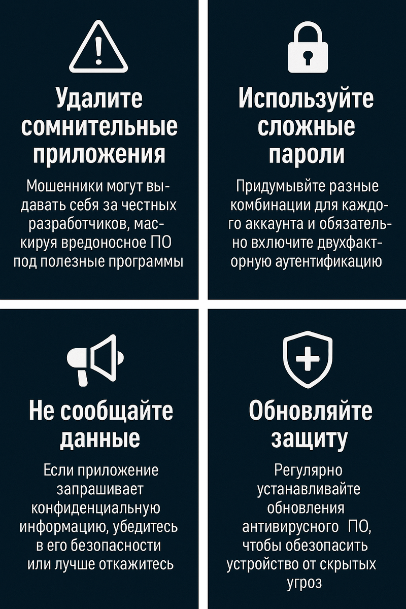 – Устанавливайте приложения только через ОФИЦИАЛЬНЫЕ магазины. APK-файлы из чатов, даже если они «от банка», несут прямой риск.