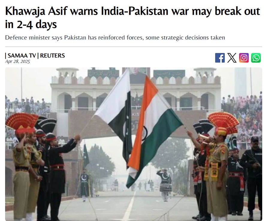 ⚡️Война между Индией и Пакистаном может начаться через два-четыре дня, сообщает Samaa TV со ссылкой на министра обороны Пакистана