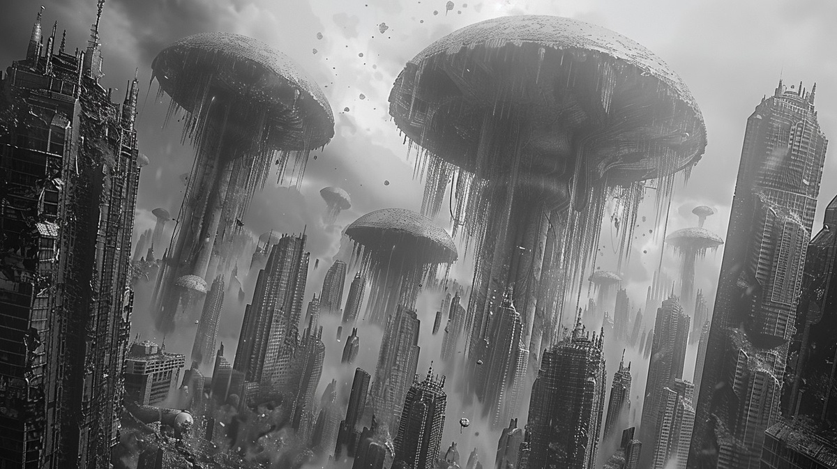 Создано на основе запроса: Microscopic non-Earth life infiltrating malls, overgrown highways, and cities
