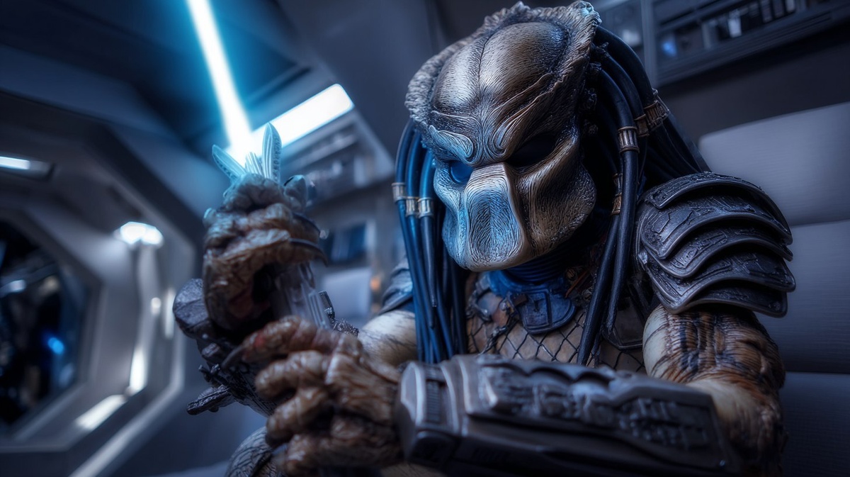 Создано на основе запроса: Predator, wearing armor and helmet! Holding a blue lightsaber, inside a spaceship with the Death Star in the