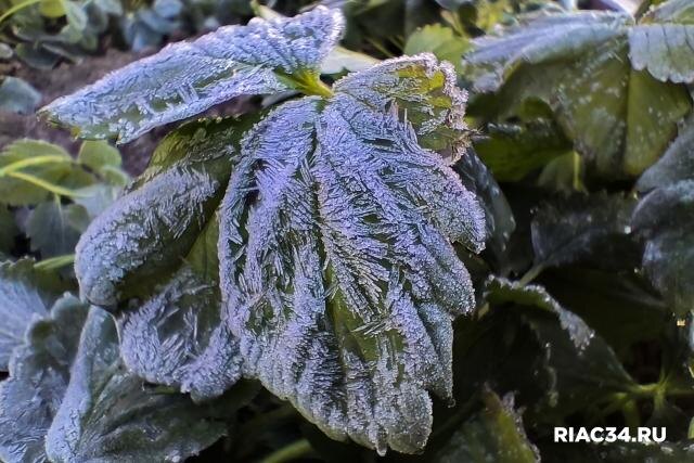 В Новоаннинском районе на утро после морозной ночи жители увидели обмерзшие цветы на клумбах и деревья в инее. Сильнее всего досталось цветущей клубнике.