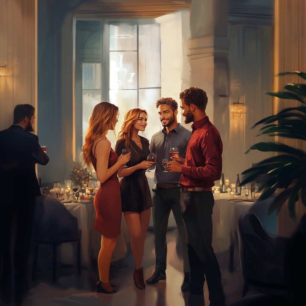 Создано на основе запроса: three people standing having a conversation. They are upscale casual. The people are photorealistic and diverse. There are four people. 2 men. 2 woman. Head to toe. THey are at a dinner party. These people should be realitic looking. Like a photo. Not an illustration. --- Автоперевод: Три человека, стоящие за разговором. Классно получилось? 🤔 https://dzen.ru/id/65c0c65c86e4f837c27b24d7 #ИИ #AI #нейросеть #midjourney #art
