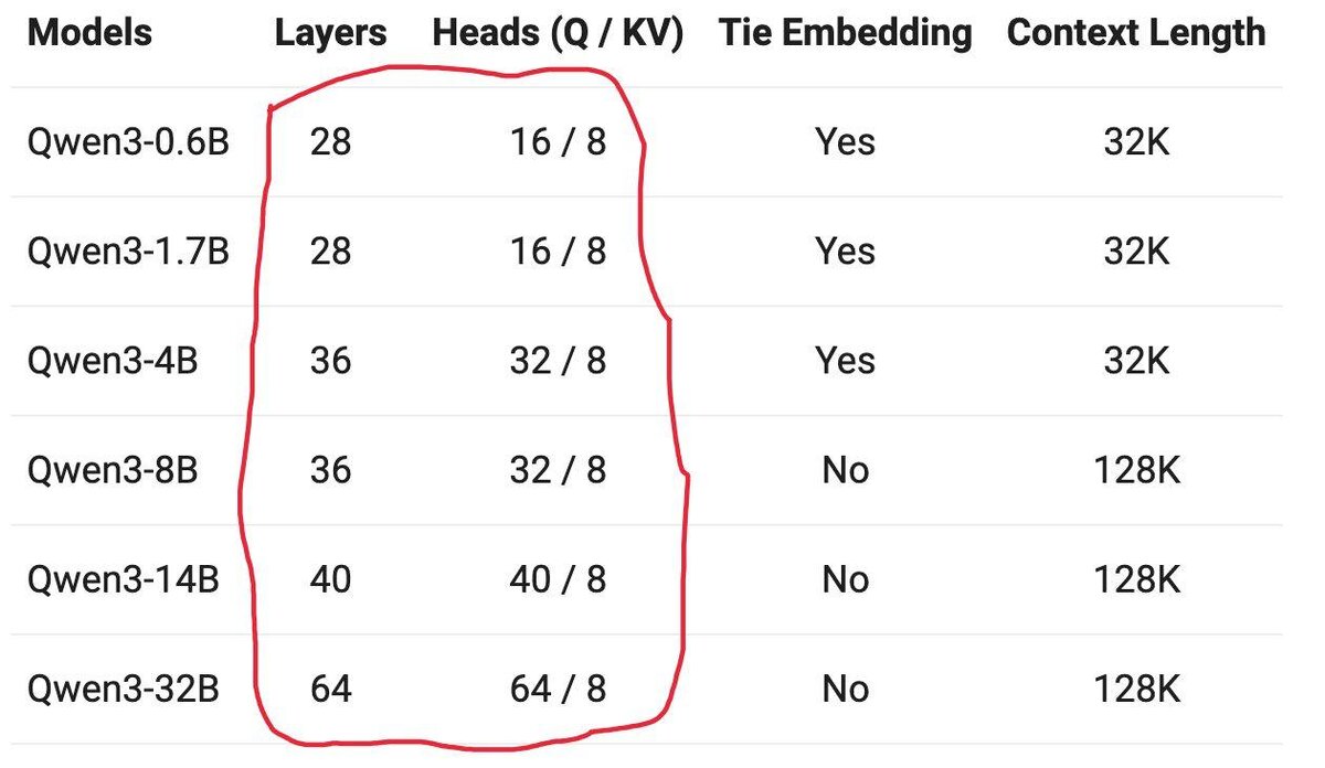 ночью вышел Qwen 3, c чем я всех и поздравляю; и без меня разберут метрики на разнообразных бенчмарках, но мой коллега обратил внимание на интересный аспект: как поменялась архитектура Qwen 3 по сравнению с Qwen 2.5 (первая и вторая картинки соотв.); количество слоев во всех вариантах осталось тем же (кроме самой маленькой модельки), но везде увеличилось количество голов внимания