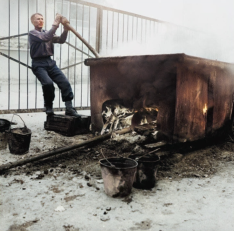 После очищения крыши начинался самый интересный процесс — плавление. Старый кир закидывали в котлы, добавляли свежий битум, и все это доводили до жидкого состояния при постоянном помешивании.
