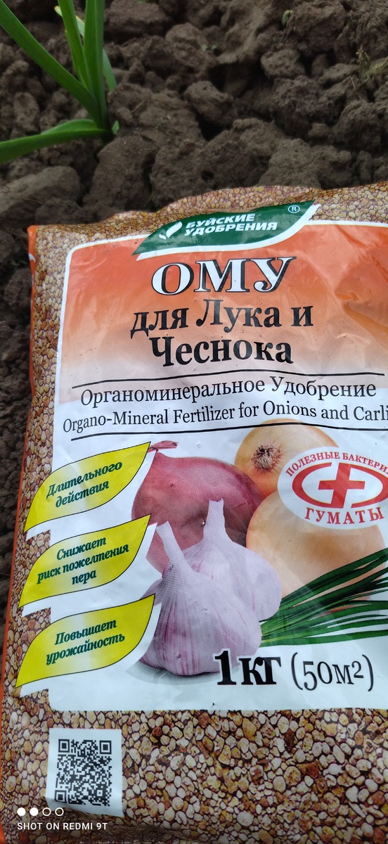 К сожалению, когда всходит чеснок, часто бывает, что начинают появлятся жёлтые пёрышки! Отчего это бывает? А это бывает тогда, когда не хватает ему каких то элементов. Что же делать? Естественно надо подкормить! В этом сезоне мы решили попробовать ОМУ для Лука и Чеснока. Мы пробовали только для картофеля. Это органоминиральное удобрение длительного действия! Он как раз снижает риск пожелтения пера. Повышает урожайность! 1кг на 50кв.м. Поверим производителю. Мы удобрили пока только чеснок, заделали плоскорезом и полили. Лук пока не взошёл. Его можно вносить и при посадке, производить подкормки при рыхлении. В течение сезона будем наблюдать за чесноком! За тем, как он будет расти! При посадке осенью вносили золу и перегной.
