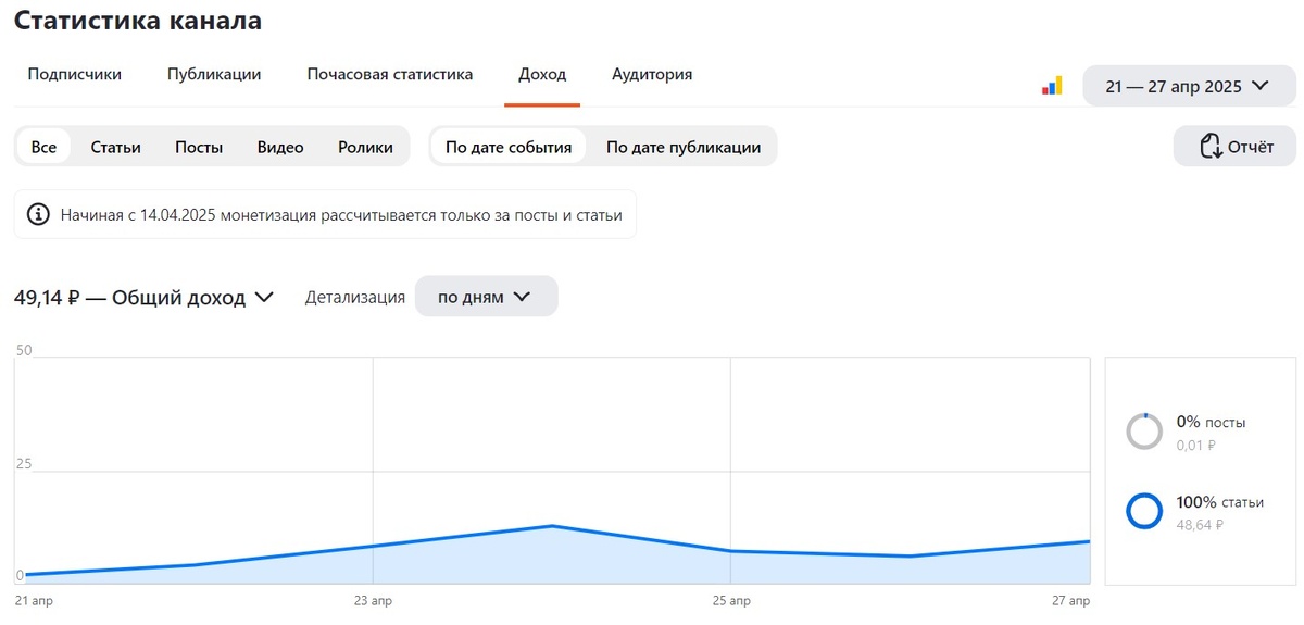 Когда-то я вела такую рубрику на постоянной основе. Сама люблю почитывать такие публикации у других авторов (хотя, раньше, конечно, было интереснее по деньгам и у меня, и у других))), поэтому кому интересно - добро пожаловать! Кому неинтересно - проходим мимо, не задерживаемся. Итак, мой доход на канале за неделю с 21 по 27 апреля 2025 года. Смотрим статистику: Что-то прямо совсем грустненько. Даже 50 рублей нету за 7 дней. Хотела написать за 7 дней работы, но какая же это работа. ) Так, развлечение. Но, честно говоря, после того, как я узнала, что тут все же идет стаж и баллы, мне захотелось как-то разогнать доход на площадке. Все время мне хочется зарабатывать там, где мне платят копейки. Эх... Но я реально настроена попробовать повысить доход на этом канале, и у меня даже (не поверите!) есть план. ))) В общем 49 рублей и 14 копеек за неделю... Мда... Ну и посмотрим, какие публикации принесли больше всего дохода? ТОП-5 за неделю: Очень смешно называть топовыми статьями те,