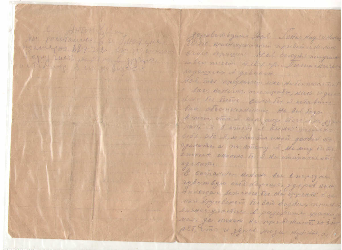 «17 сентября 41 г. Ася, пока это мое письмо дойдет до тебя, я думаю, что ты будешь уже буквально ожидать нового члена нашей семьи. Осталось несколько последних дней. А может быть, он уже появился на свет. Так что у меня будет одно пожелание — благополучного исхода. Желаю быть тебе здоровой и родить здорового ребенка. Кто он будет, девочка или мальчик, — неважно. Только бы все прошло благополучно. Обо мне не беспокойся. Я здоров как никогда.