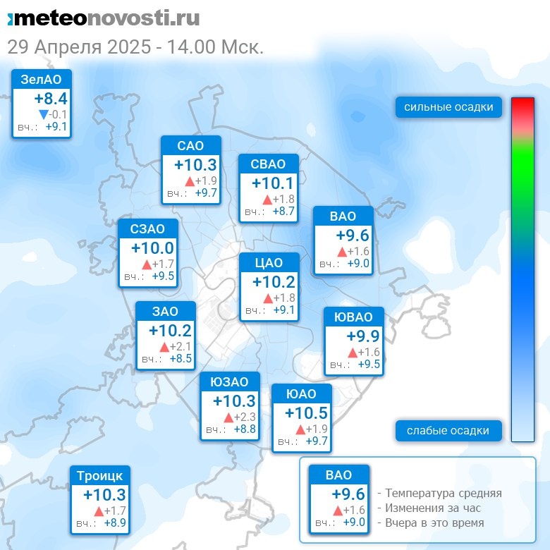 В 14:00 в Москве было от +8.2°C до +11°C, средняя температура +10.1°C #погода #Москва #весна #температура #29апреля #вторник