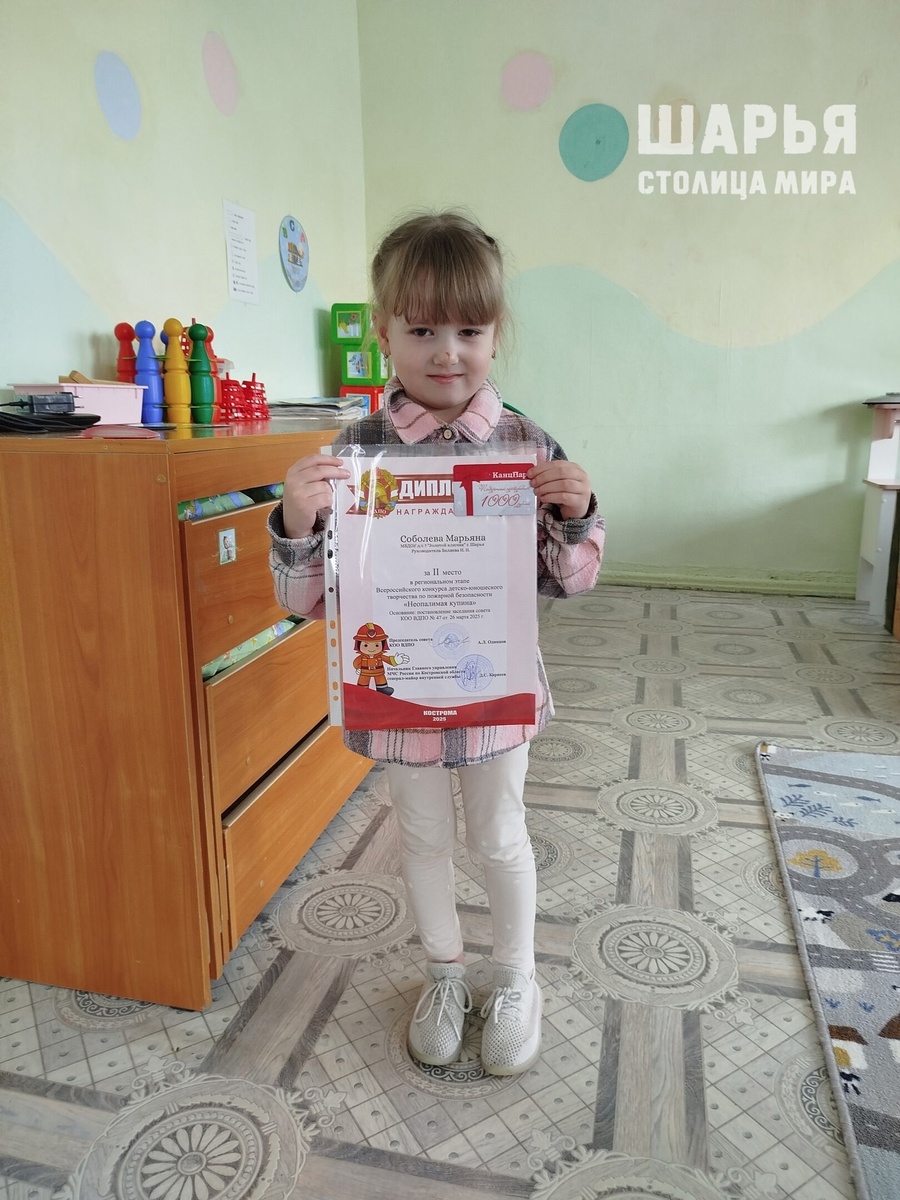 Юная шарьинка стала призером регионального этапа Всероссийского конкурса Воспитанница старшей группы "Буратино" Детского сада №7 "Золотой ключик" Шарьи Марьяна Соболева приняла участие во Всероссийском конкурсе детского рисунка "Неопалимая Купина". Рисунок юной художницы вышел на региональный этап, где ему присудили диплом 2 степени. И вот, торжественный день для Марьяны наступил совсем неожиданно. Председатель Шарьинского отделения Всероссийского добровольного пожарного общества Фролова Любовь Александровна вручила девочке диплом 2 степени за участие в региональном этапе Всероссийского конкурса и денежный сертификат. Дети, вместе с Марьяной посещающие детсад и ставшие свидетелями церемонии награждения, тепло поздравили юную художницу. Шарья – столица мира Крупнейшее городское СМИ Источник