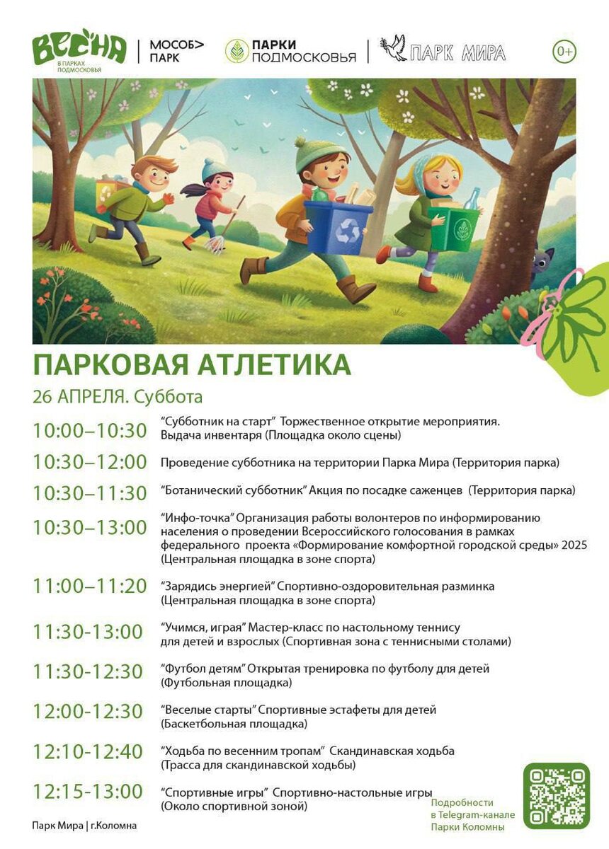 ☀️💚 Друзья, приглашаем вас 26 апреля на мероприятие «Парковая атлетика» в наши любимые парки! Вас ждут: 🏋️♀️ Открытые тренировки на свежем воздухе 🎓 Мастер-классы 🎲 Спортивные и настольные игры 🌳 Акция по посадке саженцев — поможем сделать наш парк еще краше и зеленее. И еще множество других интересных активностей! Присоединяйтесь и проведите время с пользой и удовольствием! 🌿✨ #ГородскойОкругКоломна #Коломна #КоломнаОзёры #Подмосковье #НашеПодмосковье #Московскаяобласть