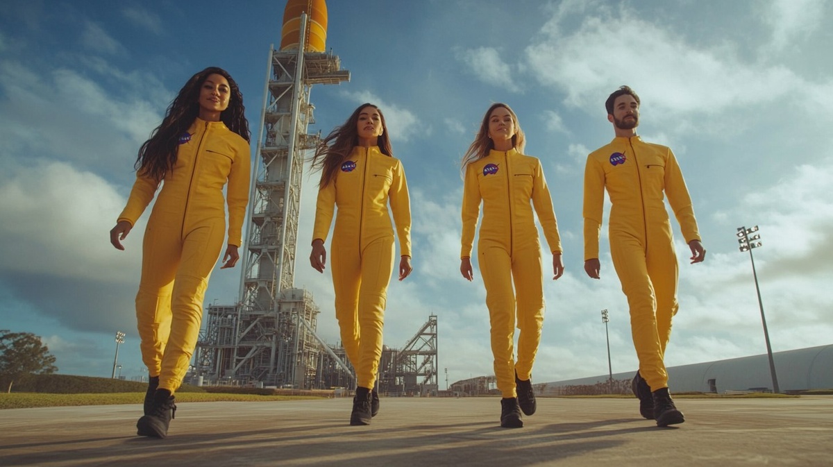 Создано на основе запроса: Realistic style, cinematic still, wideshot, slight hero shot, 2 women and 2 men in tight yellow spandex uniform walking towards camera, different ethnies, hip influencer people, cape canaveral space center, dramatic morning light, blue sky, selective colour accent on uniforms, --- Автоперевод: Реалистичный стиль, кинематографический, Wideshot, небольшой выстрел в героях, 2 женщины и 2 мужчины в узкой желтой спандексской форме, идящих к камере, разные этницы, люди, влияющие на бедра, космический центр мыса Канаверал, драматический утренний свет, голубое небо, селективный цветовой акцент на униформе, Как тебе этот вариант? 🤔 https://dzen.ru/id/65c0c65c86e4f837c27b24d7 #ИИ #AI #нейросеть #midjourney #art