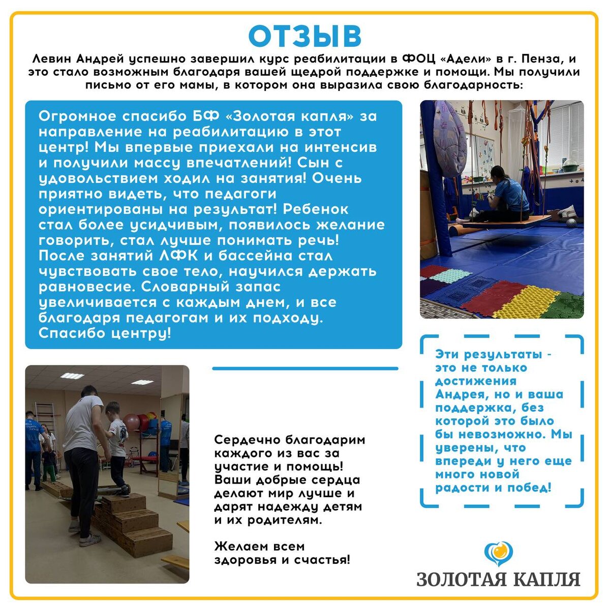 Благодаря пожертвованиям, собранным нашим фондом, Левин Андрей прошел курс реабилитации в ФОЦ «Адели».