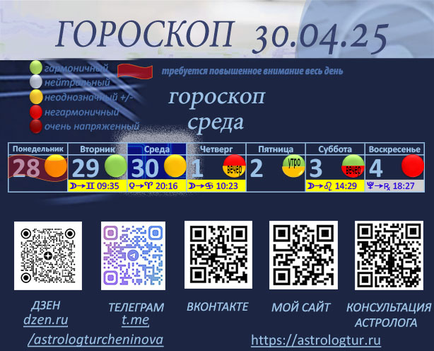 До обеда мы можем легко находить общий язык с окружающими. В это время мы будем ясно и убедительно выражать свои мысли, что поможет в решении как рабочих, так и личных вопросов. Например, это отличное время для обсуждения проектов, планирования или установления новых контактов. Также хорошее время для обучения и для поиска информации. С середины дня и до вечера может возникнуть напряжение, обострение ситуации. Мы можем почувствовать нарастающее давление со стороны окружающих, или сами стать тем человеком, который пытается навязать свою волю другим. В это время могут возникнуть конфликты, вспышки гнева. Однако, начиная с 17 часов (мск) и до позднего вечера, в наших руках окажется "спасательный круг", который может помочь не только сгладить напряженность, но и обратить ситуацию в нужное русло. Для тех у кого нечего исправлять/спасать - это время может стать очень благоприятным и обещает удачу, успех, и разные положительные события. Так что пользуемся моментом, и прикладываем благоприят