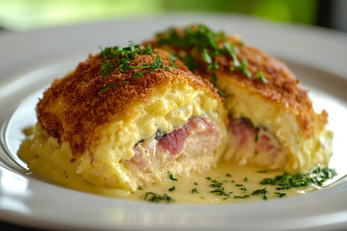 Создано на основе запроса: Title: Chicken Cordon Bleu Casserole | STYLE: Close-up Shot right view | EMOTION: realistic as possible | SCENE