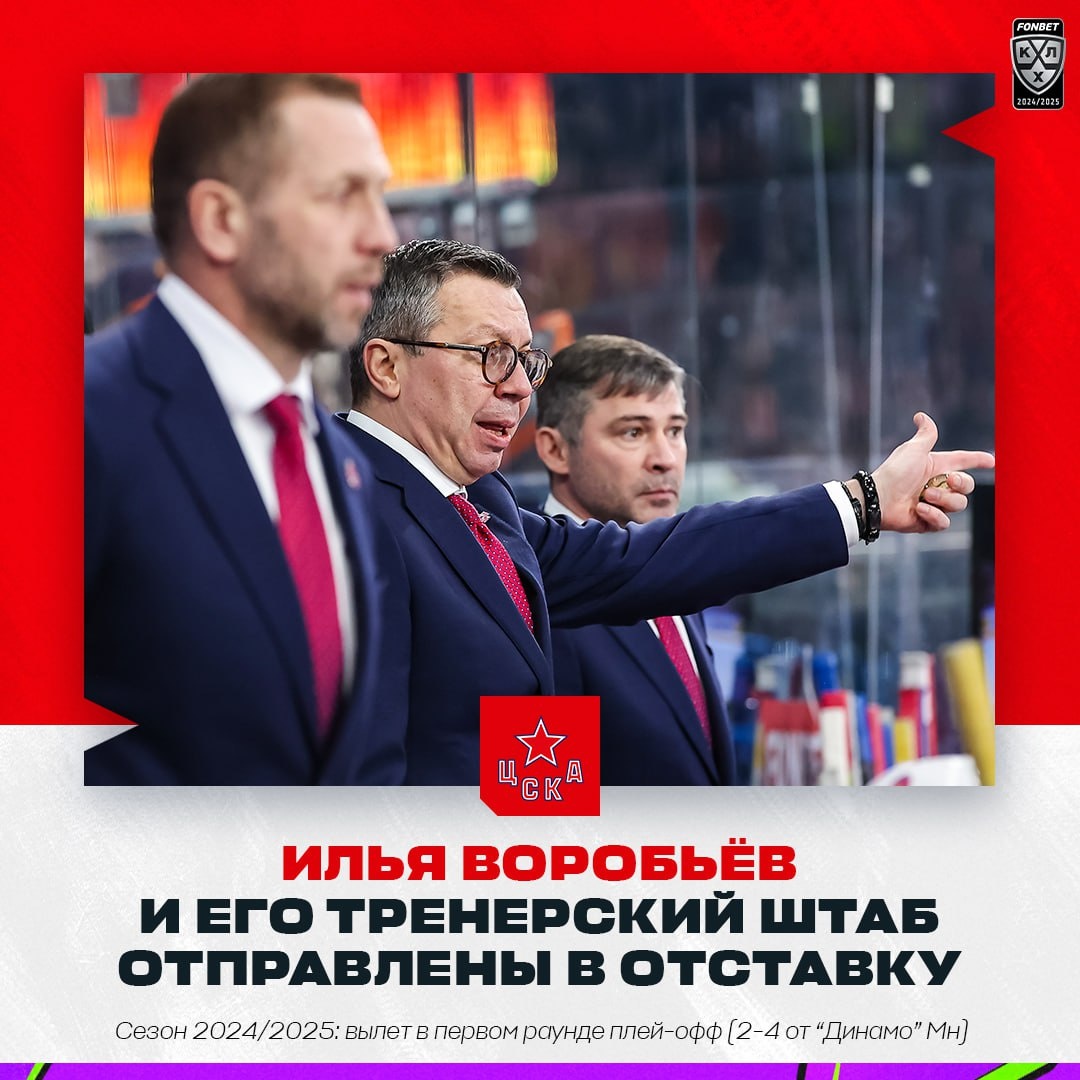 ЦСКА объявил о прекращении сотрудничества с тренерским штабом в связи с невыполнением задачи, поставленной на сезон 2024/2025. Илья Воробьёв был назначен главным тренером ЦСКА перед сезоном 2024/2025.