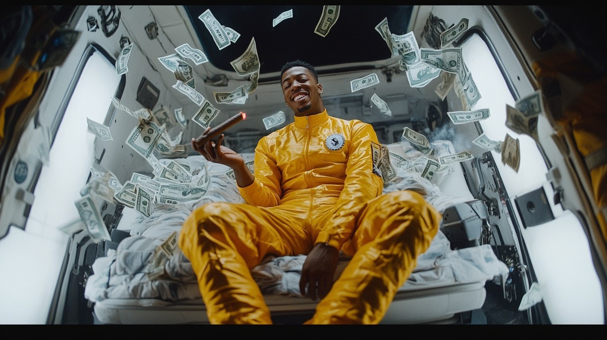 Создано на основе запроса: realistic style, cinematic still, half-lenght shot, a young black man in tight yellow spandex uniform on space ship, lights a big cigar, laughing, Money Floating around him, shot on arri alexa, in the style of an action comedy movie --- Автоперевод: Реалистичный стиль, кинематографический, наполовину выстрел, молодой черный человек в жгучей желтой форме спандекса на космическом корабле, зажигает большую сигару, смех, деньги, плавающие вокруг него, сняли на Арри Алекса, в стиле комедийного фильма боевика Хорошо выглядит? 🤔 https://dzen.ru/id/65c0c65c86e4f837c27b24d7 #ИИ #AI #нейросеть #midjourney #art