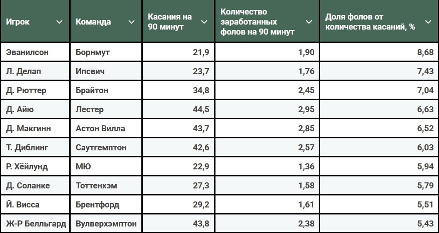* С учётом количества касаний Этот вопрос в голове возник абсолютно случайно и стало интересно, что можно увидеть в рейтингах топ-5 чемпионатов. Как написал выше, мне интересно не просто количество фолов, которое собирает тот или иной игрок, но количество фолов, относительно касаний, которые он совершает в течение 90 минут. Логика корректировки примитивна - чем сильнее обратная зависимость, тем более эффективно игрок выжимает фолы из своего владения. Данные: касания и собранные фолы в пересчете на 90 минут для топ-5 лиг План: АПЛЛа ЛигаСерия АБундеслигаЛига 1 АПЛ Быстрые наблюдения: Эванилсон уверенный лидер с отрывом в 1.25%Неожиданный Расмус в топеНе менее неожиданный Макгинн Ла Лига Быстрые наблюдения: В отличие от АПЛ очень плотная гонка за топ-2, разница - 0.03%Игроки «Вальядолида» эффективнейше собирают фолы Серия А Быстрое наблюдение: Плотная борьба за топ-4: разница до топ-5 не превыает 0.3% Бундеслига Быстрое наблюдение: Сиенза - доминатор Бундеслиги по собиранию фолов Лига 1