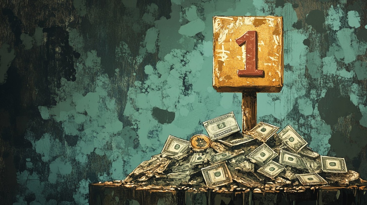 Создано на основе запроса: bitcoin on heap of dollars with large sign "#1