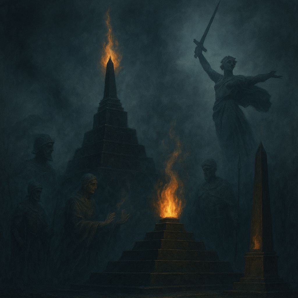 Что есть зиккурат, вознесённый к небу из камня и праха? Почему ступени к небесам похожи на свёрнутую спираль жертвы, на вложенный крик, застывший в форме? Почему все обелиски и стеллы, воздвигнутые в честь павших, следуют одному древнему коду — устремлению вверх, вспарыванию неба каменным пером? Что за знание было вложено в их соотношения, в их молчаливые оси, в их незримую геометрию? Почему в сердцах великих городов горит огонь, который не смеет быть погашенным? Почему он горит не ради света, а ради самой памяти, как будто там, под плитами, в спящем камне, живёт нечто большее, чем просто прах? Что есть Волгоград — Сталинград — земля, имя которой менялось, но суть оставалась? Почему именно здесь была остановлена тьма ценою, которую не вмещает ни одно сердце? И чем стала Родина-Мать, если не рукою, пронзающей небо, ждущей ответа от звёзд? Почему пространство этого комплекса дышит иначе, чем остальные земли, и почему камень там поёт глухими голосами ночью, когда спит страна? Кому бы