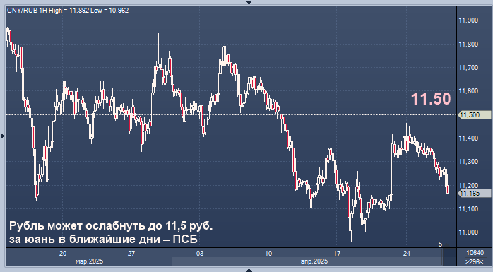 Рубль может ослабнуть до 11,5 руб. за юань в ближайшие дни – ПСБ Курс доллара к рублю расчётный, фьючерс, вечный фьючерс и межбанк. Курс евро к рублю расчётный, фьючерс, вечный фьючерс и межбанк. Курс юаня к рублю биржевой, фьючерс, вечный фьючерс и межбанк. Вероятно умеренное ослабление рубля по отношению к юаню до конца короткой торговой недели и приближение курса валютной пары к верхней границе диапазона 11-11,5 руб. за юань, сообщается в материале управляющего эксперта Центра аналитики и экспертизы банка ПСБ Дениса Попова. Геополитический новостной фон в понедельник продолжал выступать в поддержку рубля, подпитывая позитивные ожидания снижения геополитической напряженности. Национальная валюта незначительно укрепилась в понедельник, констатирует аналитик. При этом объемы биржевых торгов валютой просели на фоне завершения периода апрельских налоговых выплат. Все указывает на сохраняющуюся слабой активности импортеров на фоне жесткой денежно-кредитной политики, отмечает Попов. "Впроч