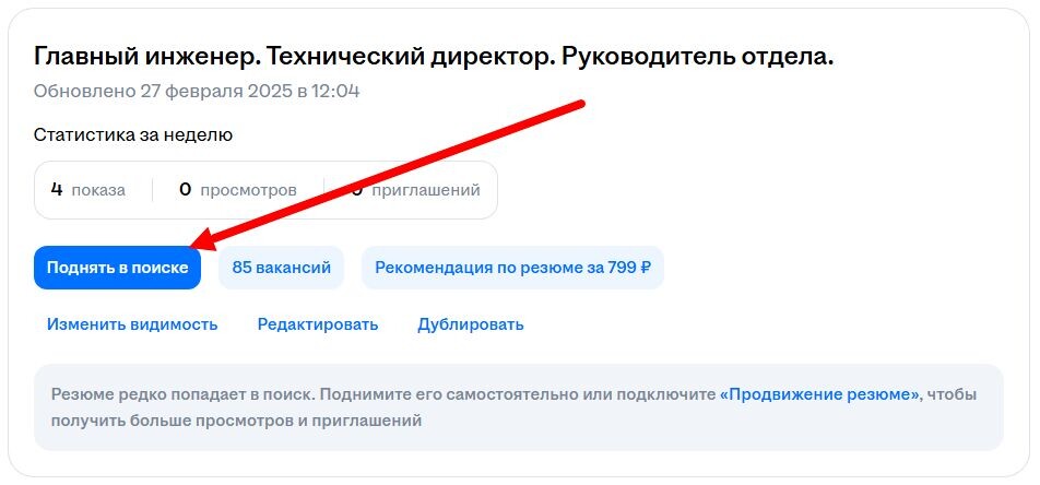 Я уже почти два года на новой работе (хотя теперь её новой уже наверно нельзя назвать). Однако время от времени я обновляю своё резюме на сайтах с вакансиями. Зачем? Ведь я пока не ищу работу! Есть несколько причин: Когда я говорил об обновлении, то я имел ввиду обновление информации. Однако есть и ещё один вид обновления, который влияет на то, насколько часто ваше резюме будет появляться в поиске. На hh, например, для этого у резюме есть кнопка ПОДНЯТЬ В ПОИСКЕ. На других площадках может быть ссылка или кнопка ОБНОВИТЬ РЕЗЮМЕ или что-то в этом роде. Если вы хотите найти работу как можно быстрее, то и обновлять таким образом резюме надо почаще. Хотя бы раз в день. Если вы лишь рассматриваете предложения, то каждый день обновлять необязательно. Но хотя бы 1-2 раза в месяц надо. Иначе ваше резюме будет болтаться “на самом дне” и никаких предложений вы не дождётесь. Если же вы не ищете работу, тогда можно совсем не обновлять (не поднимать в поиске). Поскольку для вас в данное время это не