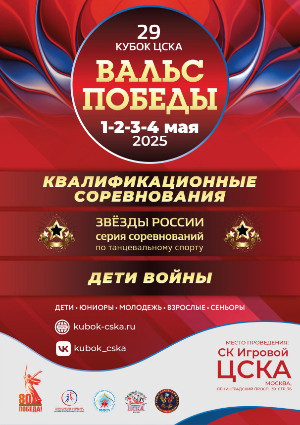 📃 Программа. XXIX ВАЛЬС ПОБЕДЫ-2025 - Региональные соревнования категории РСА - Квалификационные соревнования ФТСАРР - V заключительный этап серии «Звёзды России». 🧭 Москва, Ленинградский проспект, 39 стр. 76 🚇 метро ЦСКА 🏛 Спортивный комплекс ЦСКА «Игровой» 🎓 Центр танцевального спорта ЦСКА ☎️ +7 (916) 509-3999. Виктория Кокоулина ✉️ waltz-of-victory@mail.ru ℹ️ Массовый спорт, общая информация ☎️ +7 (926) 944-2223. Юлия