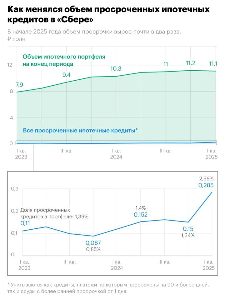 Сбербанк в 1 квартале 2025г столкнулся с резким ростом просроченной задолженности по розничным и ипотечным кредитам. Рост просрочек продолжится, однако в банке считают ситуацию контролируемой 🤷♂️...