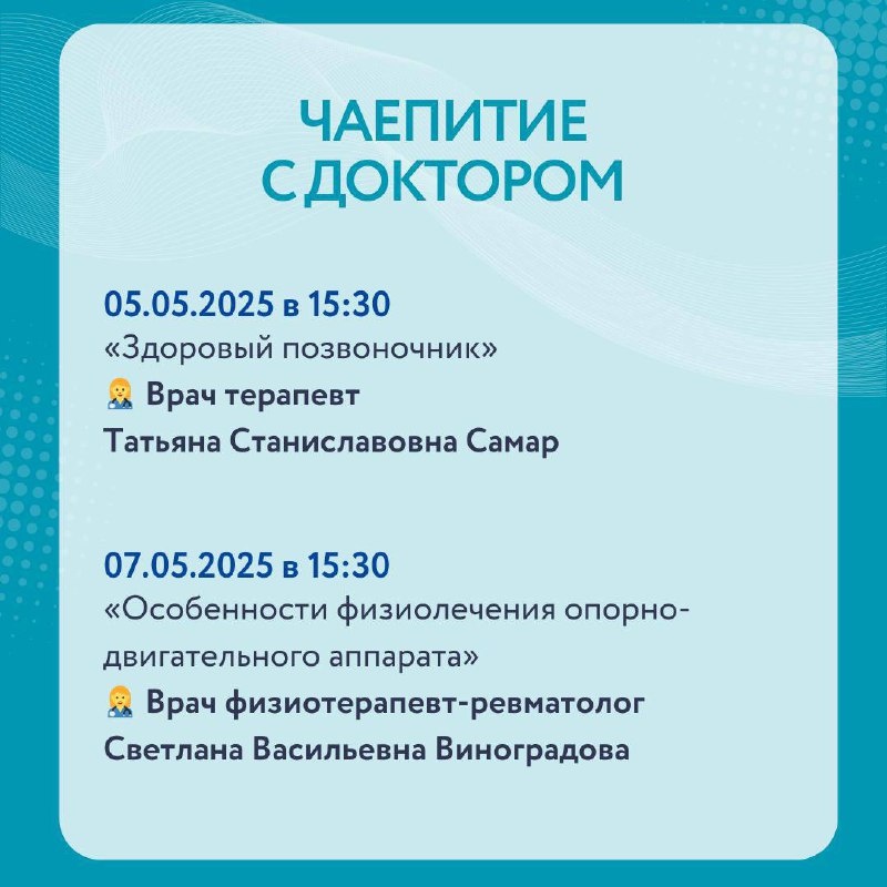 Чаепитие с доктором в кофейне «Пушкин» Мы приглашаем вас на теплые встречи за чашечкой чая с ведущими специалистами лечебно-диагностического центра ДИЛУЧ. В уютной атмосфере вы сможете задать важные вопросы, узнать больше о профилактике и лечении различных заболеваний, а также получить профессиональные рекомендации. В уютной атмосфере вы сможете пообщаться с высококвалифицированными специалистами и получить ответы на интересующие вас вопросы. 📍Кофейня «Пушкин» ул. Калинина, 23 Вход свободный. Мы ждем вас! 🌿