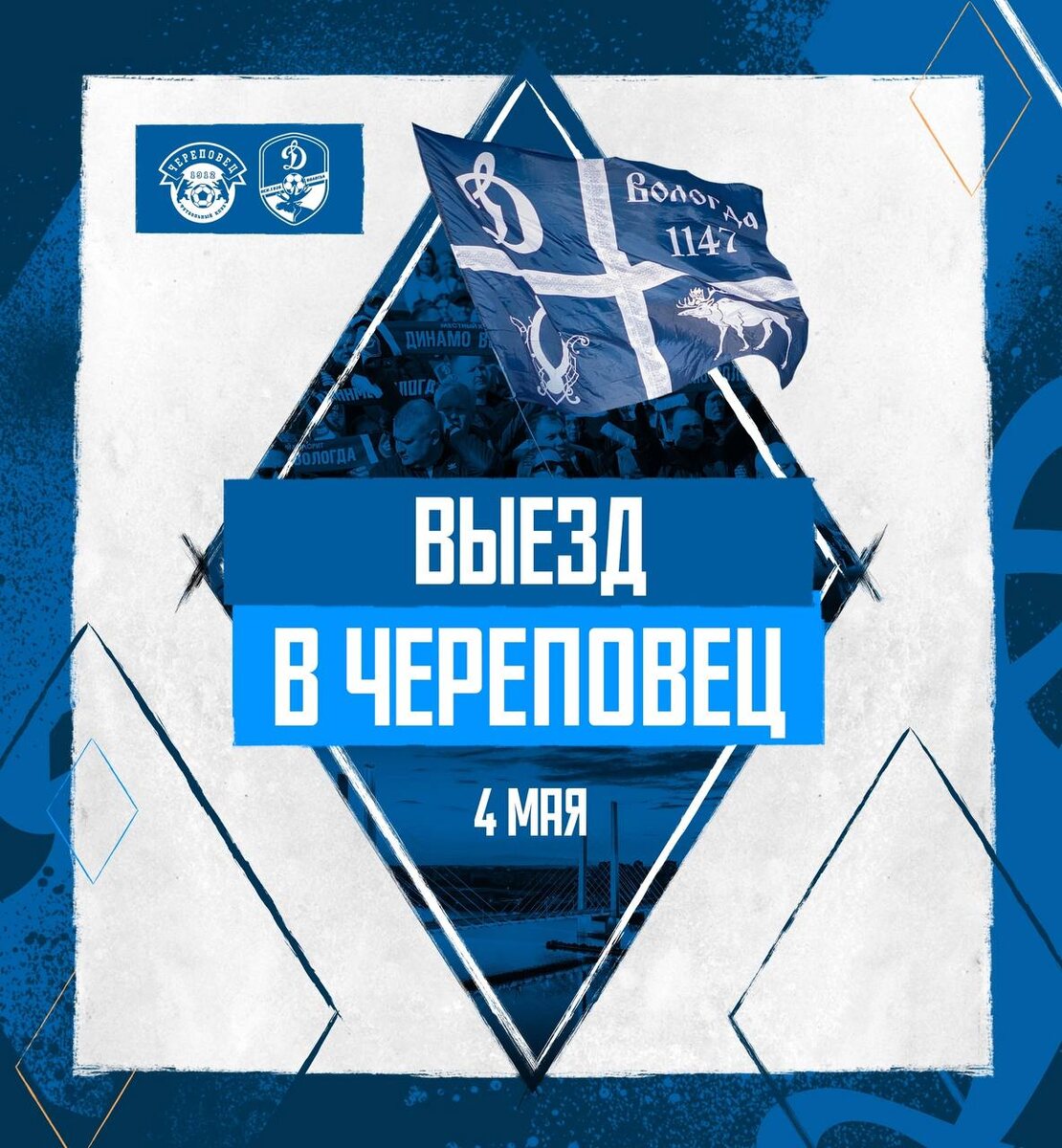 Уважаемые болельщики! Футбольный клуб «Динамо» Вологда организовывает выезд на игру против команды «Череповец», которая состоится 4 мая (воскресенье) в 17:00. Стоимость поездки — 1000 рублей. Выезд из Вологды — 04 мая в 13:00. Для бронирования места пишите сотруднику по работе с болельщиками. В случае, если вы планируете самостоятельно добраться на матч в Череповец, то просим также сообщить об этом сотруднику по работе с болельщиками, чтобы мы согласовали с принимающим клубом количество билетов и мест для болельщиков «Динамо». @dynamovologda