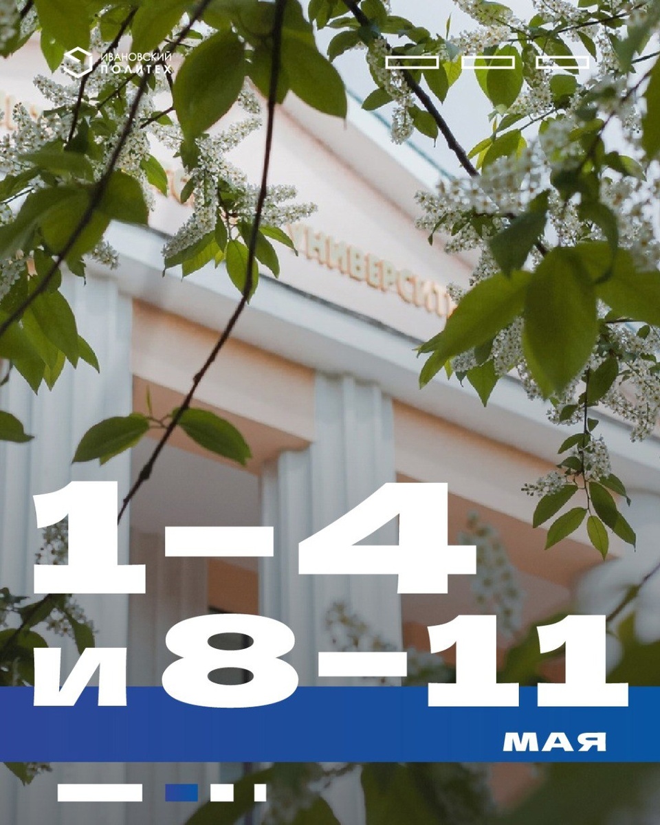 Майские выходные 💙 1–4, 8–11 мая — выходные дни 5–7 мая — учебные дни