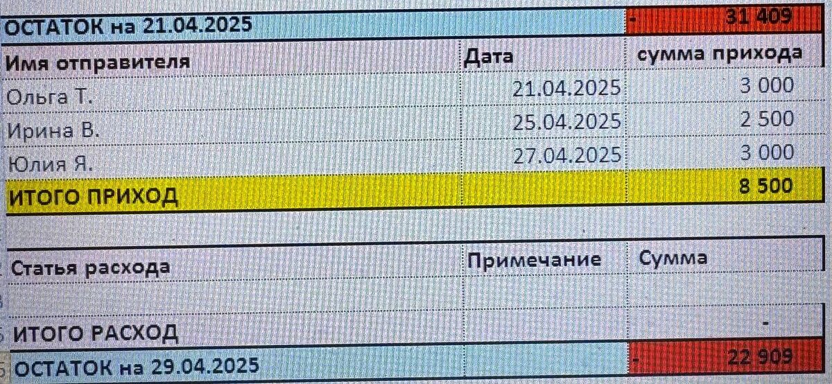 #Отчет 29.04.2025 Благодарим Вас 🙏 за помощь хвостикам 🐕🦺🐕🦺🐕🦺🐕 Собираем средства на погашение долга и оплату передержки на май месяц 🙏 Ханни оплачена финкуратор Клавдия Нола 18000 (4500 оплата от Ирины) Хлоя 9000 Рая 9000 ‼️можно напрямую на передержку заказать сухой корм всегда актуально: сухой корм - в месяц нужно 30 кг, вкусняшки, консервы, шлейки для прогулок ‼️ актуальным является квартирная домашняя передержка - готовы рассмотреть стоимость и обеспечим всем необходимым: кормом, амуницией‼️ еженедельно можно поехать и познакомиться с хвостиками Карты привязаны к номерам телефонов: +7 985-977-03-22 Альбина (Сбер, Тинькофф) +7 916-069-34-82 Елена (Сбер) Подпись: «для собак» или «благотворительность»